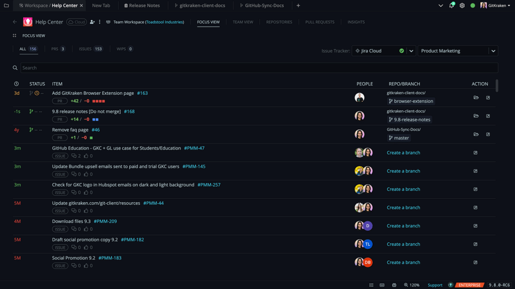 In addition, by providing visibility on pull requests and issues for all repositories in their Workspace, GitKraken’s Team View helps developers prioritize their tasks and see what needs immediate attention. Open repos. Open issues. Or checkout branches right from the Workspace.